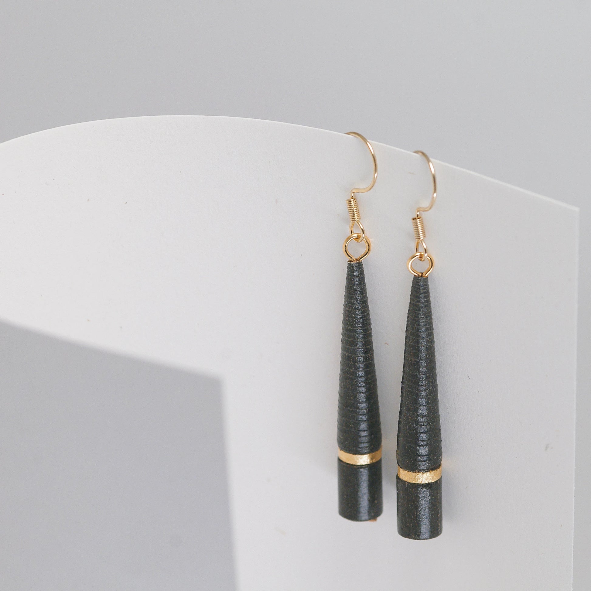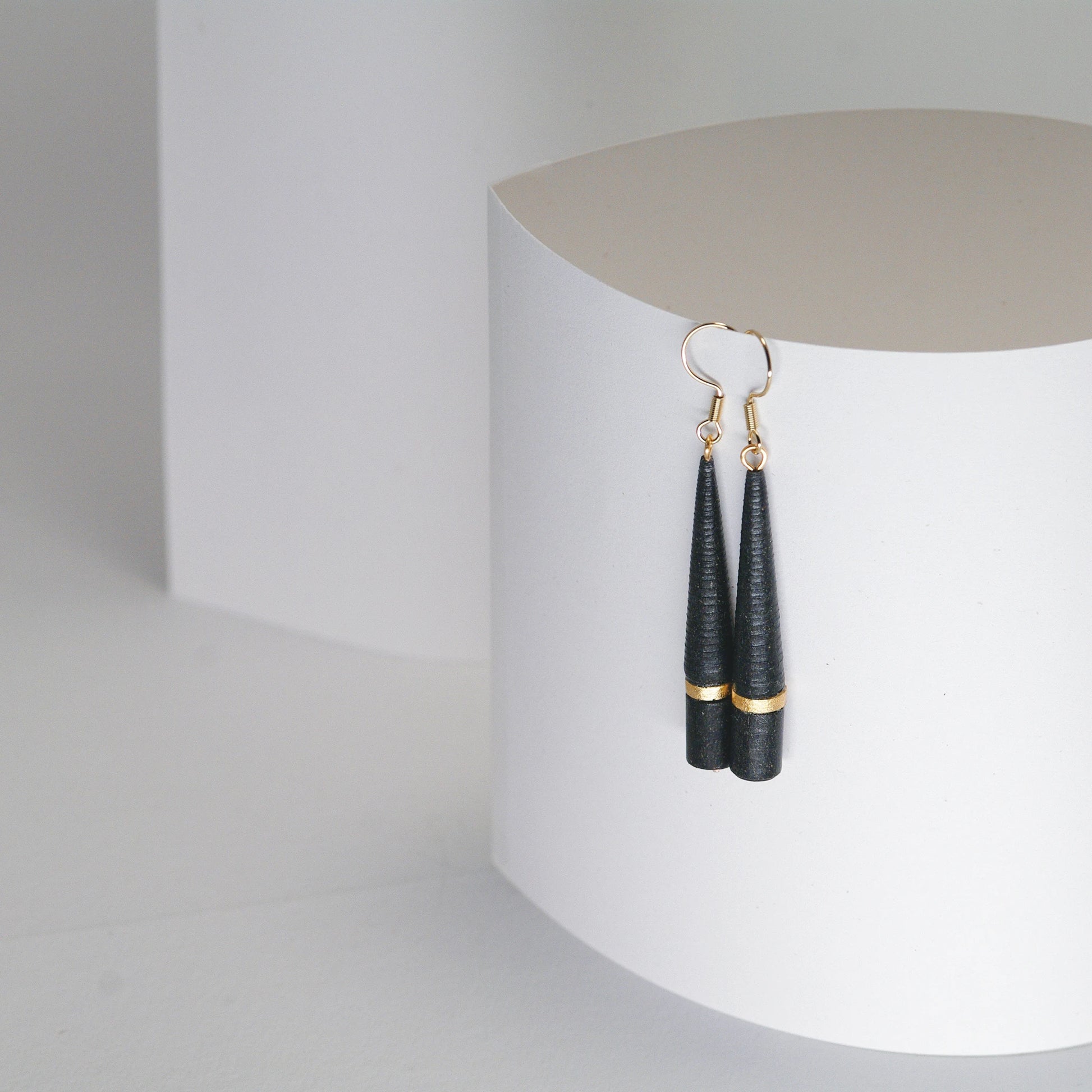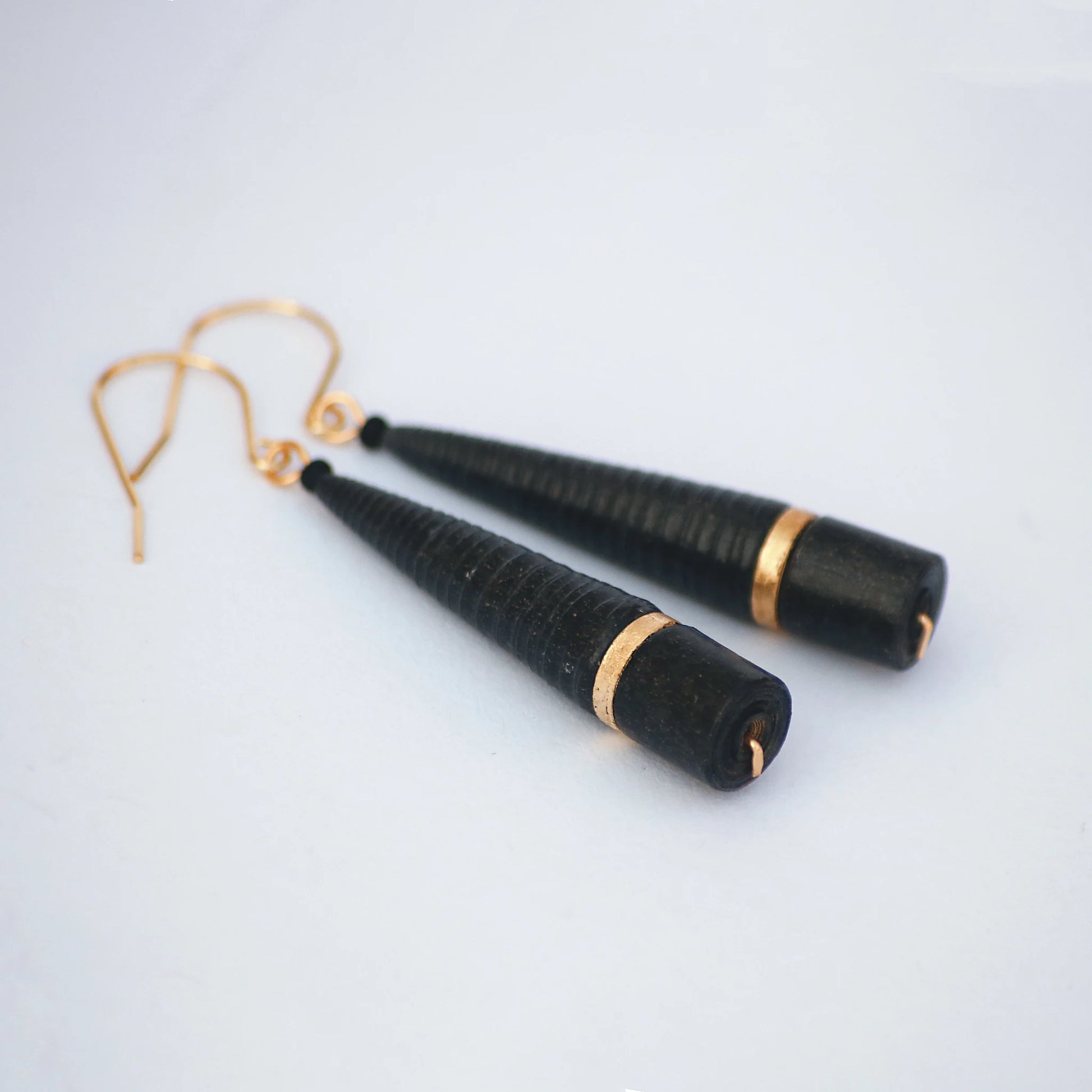 Realizaţi din mărgele de hârtie neagră modelate într-o formă conică sculpturală şi evidenţiaţi printr-o bandă fină de foiţă aurie, aceţti cercei oferă o prezenţă subtilă dar puternică.
