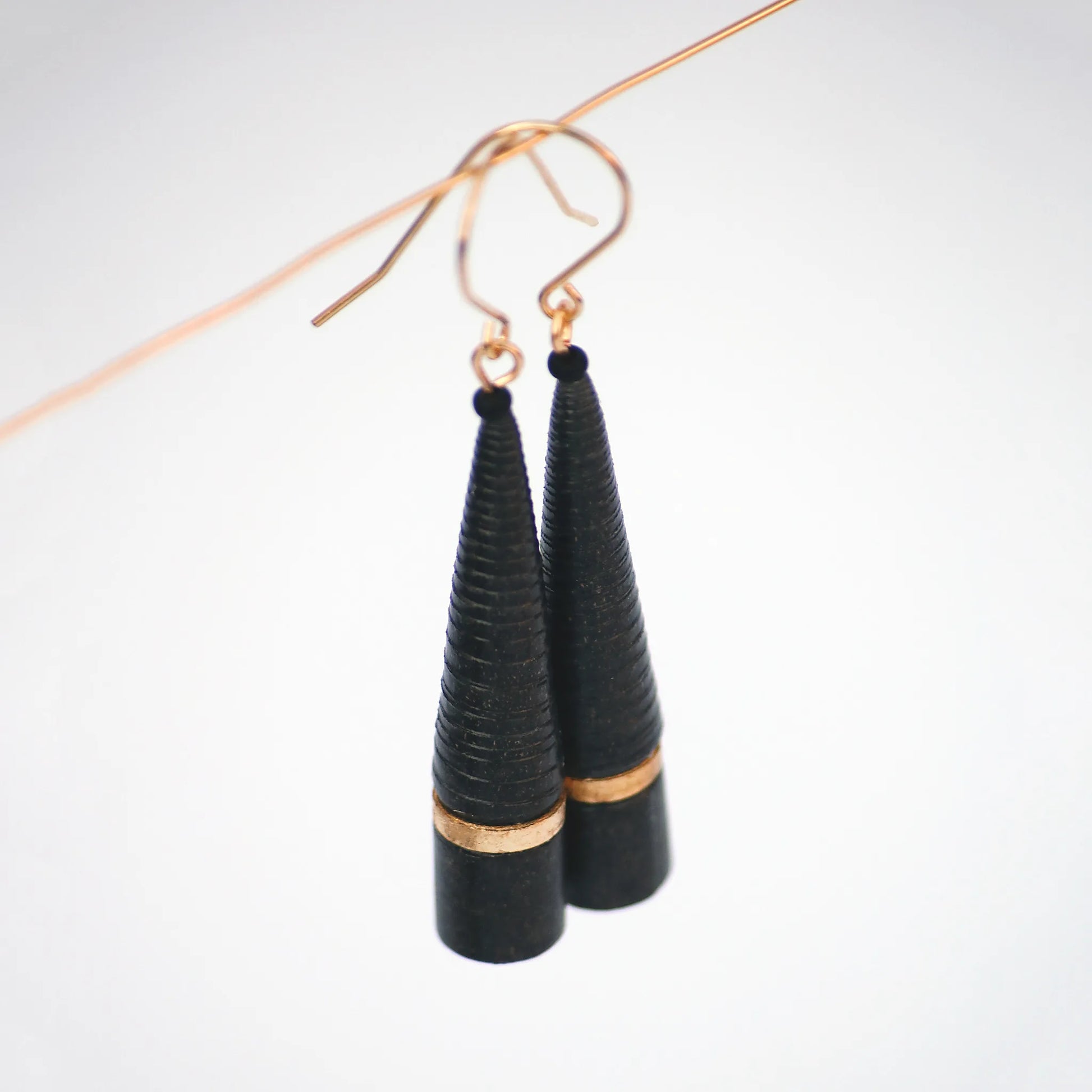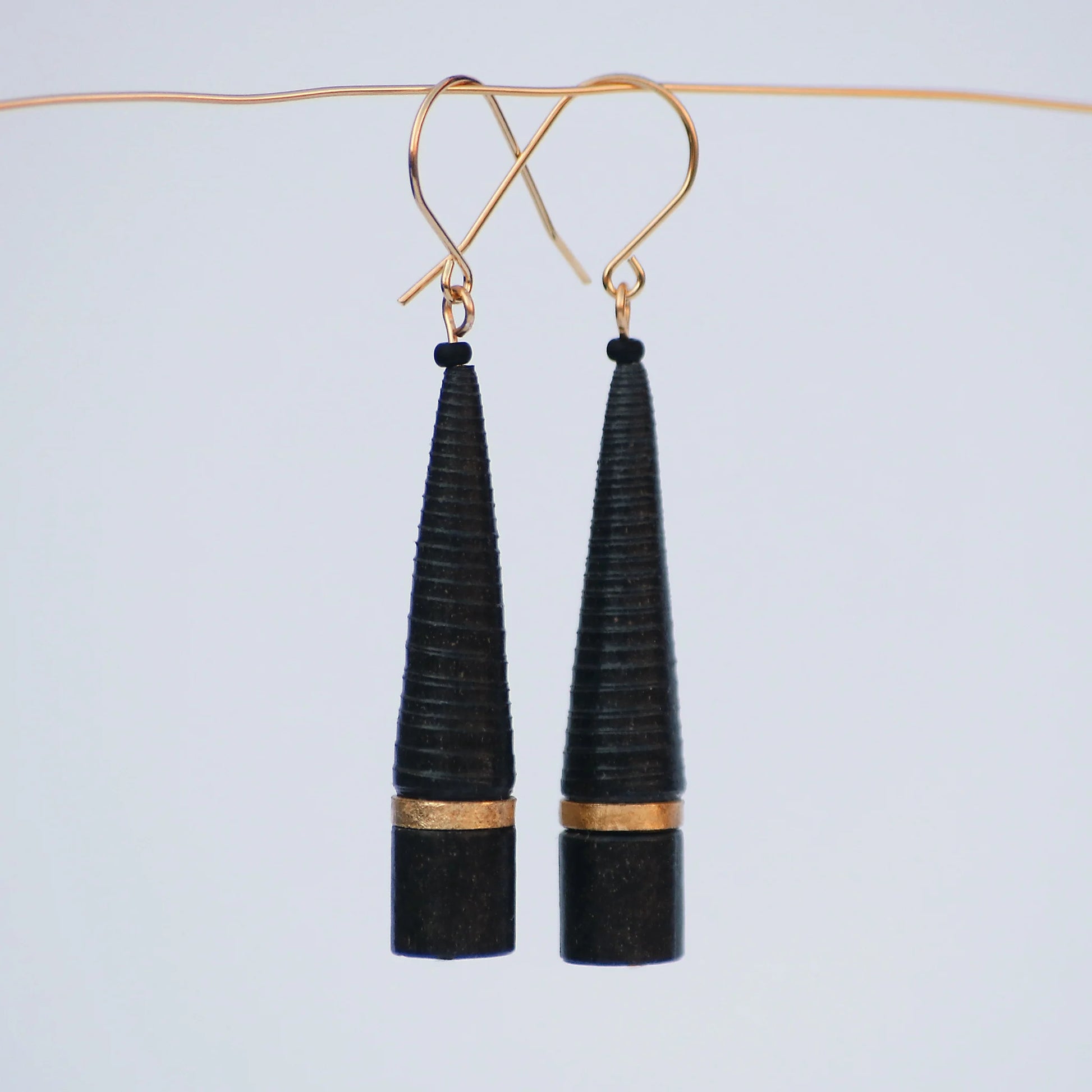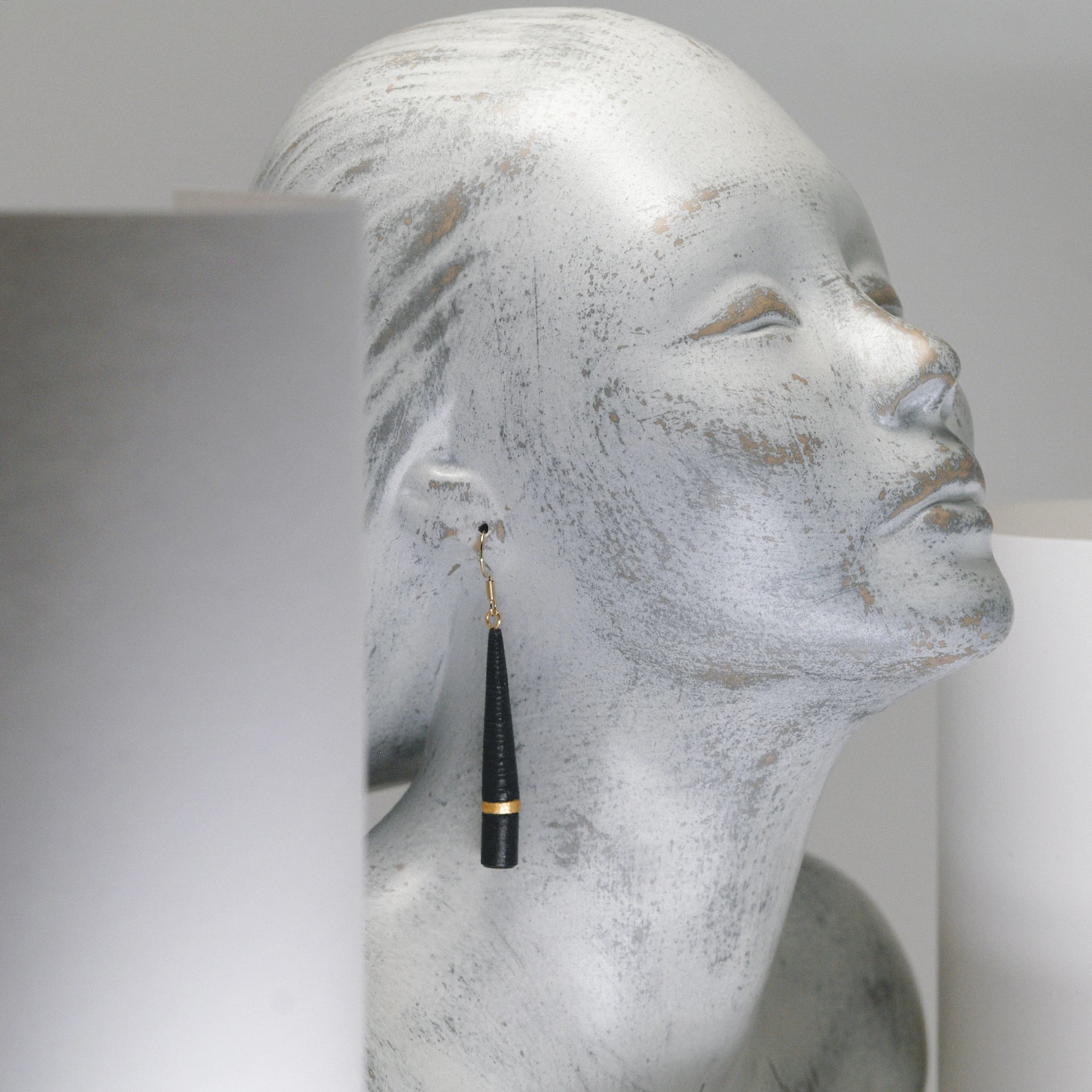 Realizaţi din mărgele de hârtie neagră modelate într-o formă conică sculpturală şi evidenţiaţi printr-o bandă fină de foiţă aurie, aceţti cercei oferă o prezenţă subtilă dar puternică.