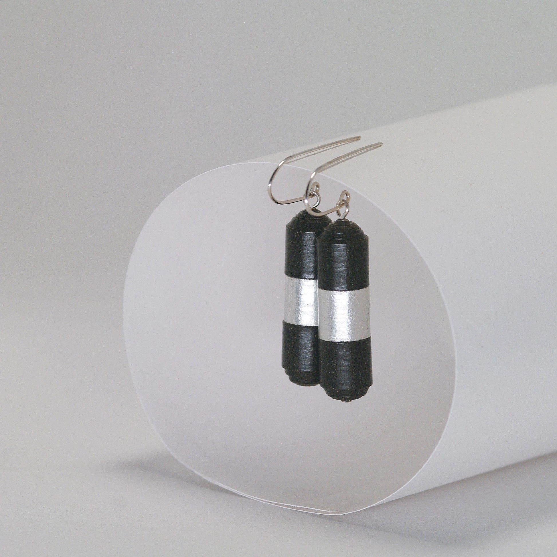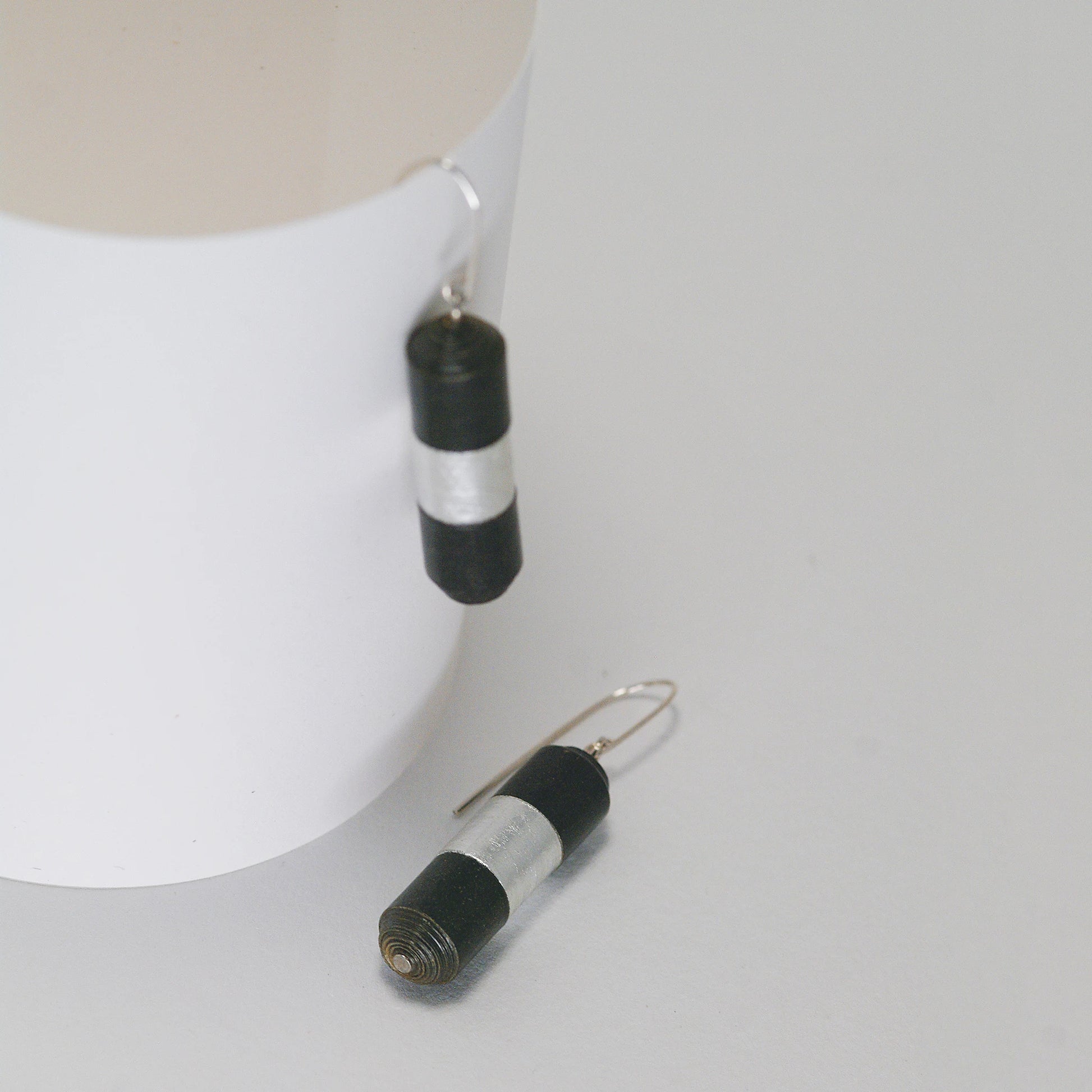 Cercei cu o estetică minimalstă şi contrast rafinat între negrul mat şi strălucirea argintie.