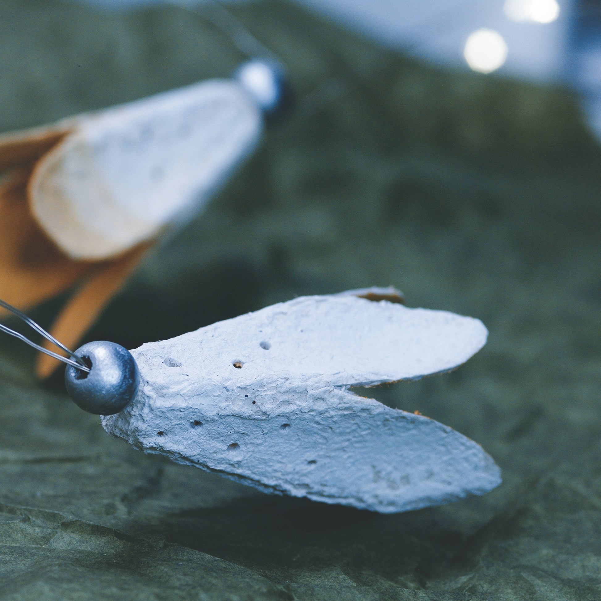 Materiale: cofraje de ouă reciclate, pictate manual cu culori acrilice, mărgele lemn aurii/argintii.