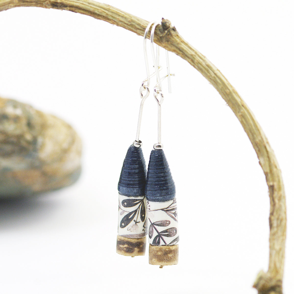 A two-piece, eco-friendly jewelry set consisting of earrings and necklace made from discarded wrapping paper and old book pages painted with blue ink.